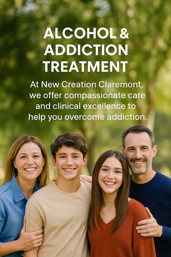 At New Creation Claremont, we understand that every journey through addiction is deeply personal. That’s why our accredited team provides compassionate, individualized care in a safe and supportive environment. As part of the trusted His House New Creation Treatment Centers network, we bring more than 30 years of expertise in helping individuals and families heal. From your first call to your first day of recovery and beyond, we’ll be with you every step of the way—guiding you toward lasting health, hope, and a life free from alcohol and drugs. Call us anytime—help is here.